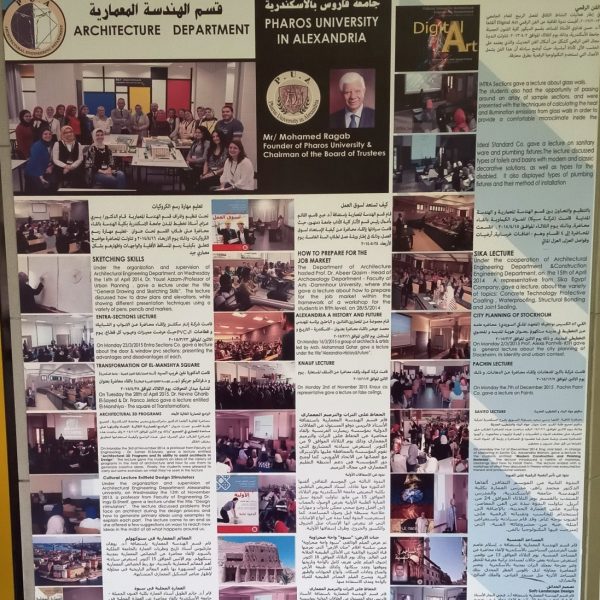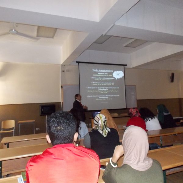 تم إلقاءها لطلبة قسم العمارة بكلية الهندسة بجامعة الأسكندرية ..تحت رعاية الأستاذ الدكتور نجوى ذكي ..وإشراف الأستاذ الدكتور دينا نصار ..كما تم التدريب العملي بحدائق الكلية .